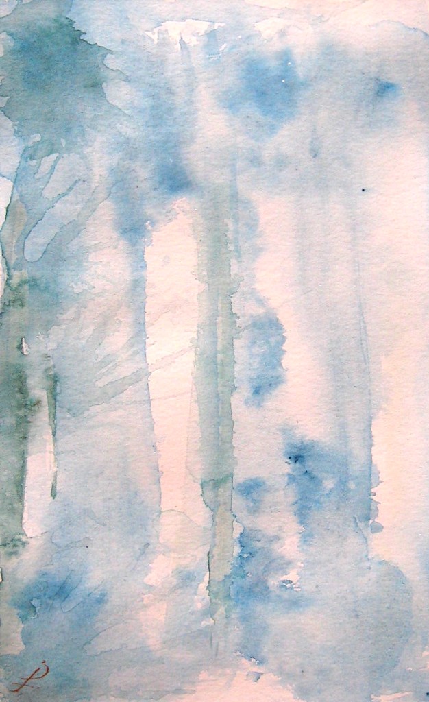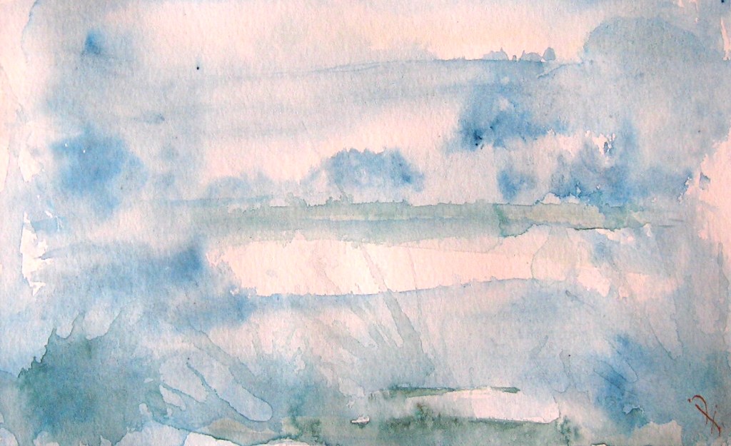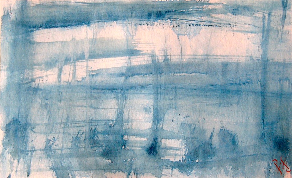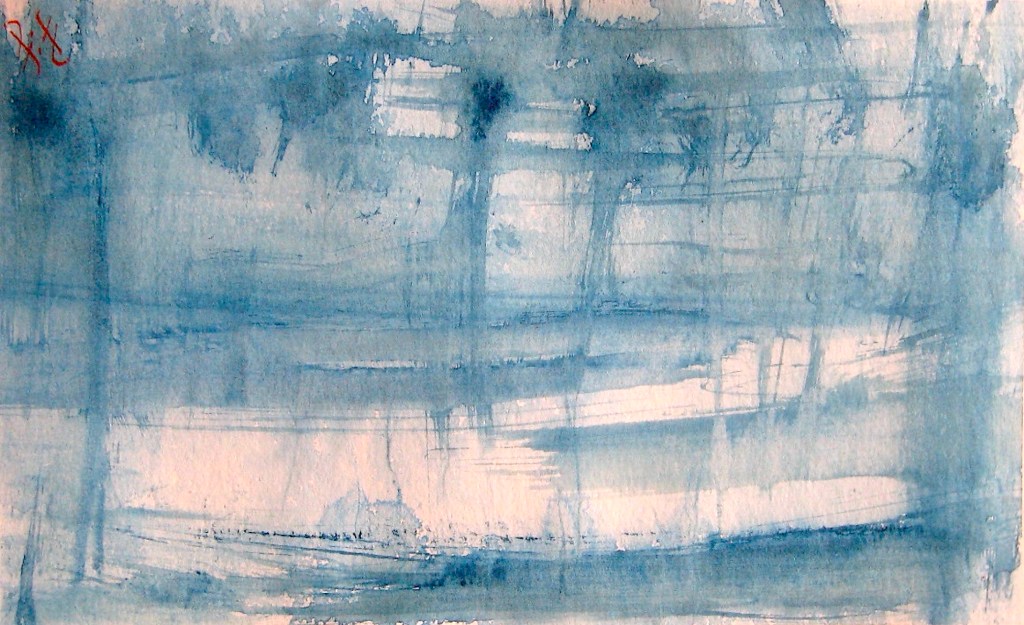 Abstract Landscape 4a, b, c, d. Four! Count ‘em – four coherent images on one piece of paper. I see a sort of darkening, perhaps twilight, marshy view, then a forest, then heavy rain over what might be a farmhouse, and finally another forest view.